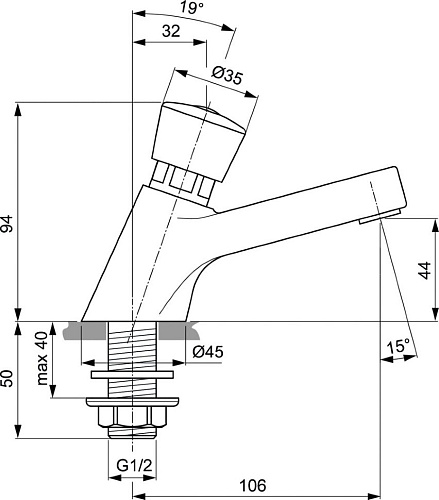 ALPHA Нажимной набортный кран для раковины, без смешивания, пропускная способность 5 л/мин. время подачи 7 сек, подводка 1/2", синий индекс на рукоятке.