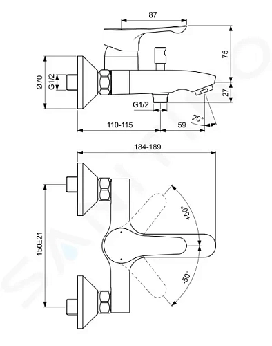 ALPHA Однорукоятковый настенный смеситель для ванны/душа, монтаж на стандартных эксцентриках, литой излив, аэратор Perlator, картридж 35 мм с функцией HWTC (ограничение максимальной температуры горячей воды), с функцией CLICK (ограничение потока воды), металлическая рукоятка с индикатором горячей/холодной воды, автоматическое переключение ванна/душ, обратный клапан, без душевого гарнитура.