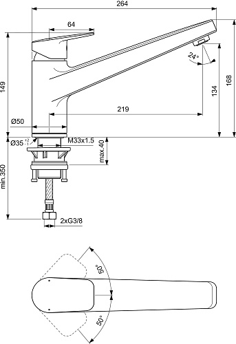 CERAPLAN Смеситель для кухонной мойки с зоной комфорта 130 мм (высота под аэратором), поворотный литой корпус, монтаж IS-Fix - крепеж на центральной гайке M33x1,5 с двумя блокирующими винтами (обеспечивает стабильную фиксацию смесителя), с дополнительным пластиковым опорным кольцом для монтажа на металлической мойке, гибкая подводка G3/8", картридж FirmaFlow 28 мм с функцией HWTC (ограничение максимальной температуры горячей воды), с функцией CLICK (ограничение потока воды), металлическая рукоятка с индикаторами горячей/холодной воды, легкоочищаемый силиконовый аэратор, соответствие EN817.