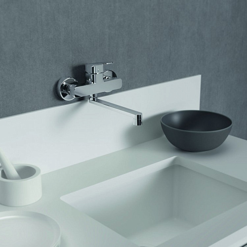 CERAPLAN Настенный смеситель для кухонной мойки с поворотным трубчатым изливом 200 мм, монтаж на стандартных эксцентриках, картридж FirmaFlow 38 мм с функцией HWTC (ограничение максимальной температуры горячей воды), с функцией CLICK (ограничение потока воды), металлическая рукоятка с индикаторами горячей/холодной воды, легкоочищаемый силиконовый аэратор, соответствие EN817.