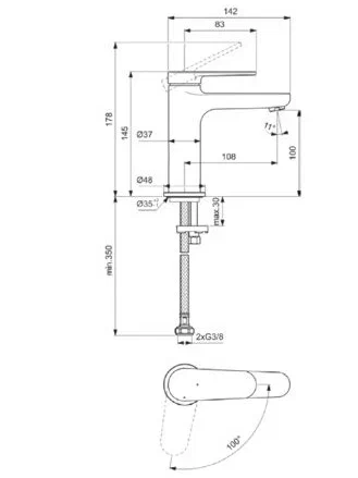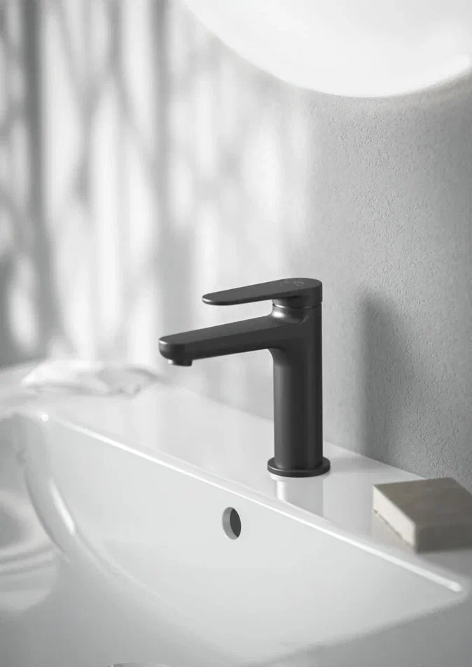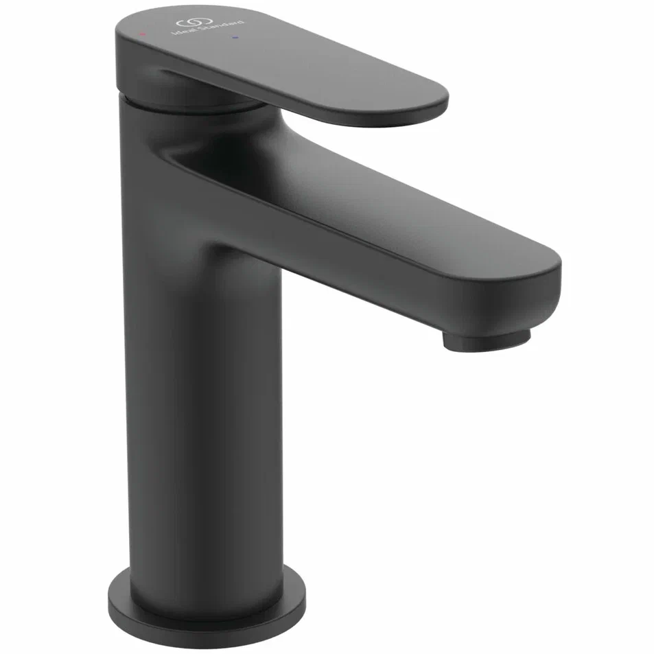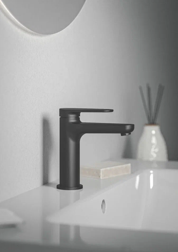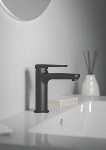 CERAFINE O NUOVO Смеситель для раковины H100, керамический картридж FirmaFlow 28 мм с функцией HWTC (ограничение максимальной температуры горячей воды), металлическая рукоятка с индикаторами горячей / холодной воды, аэратор 3,8 л/мин, система монтажа EASY-FIX (облегченный монтаж), гибкая подводка G3/8", технология Blue Start. Упаковка без пластика.