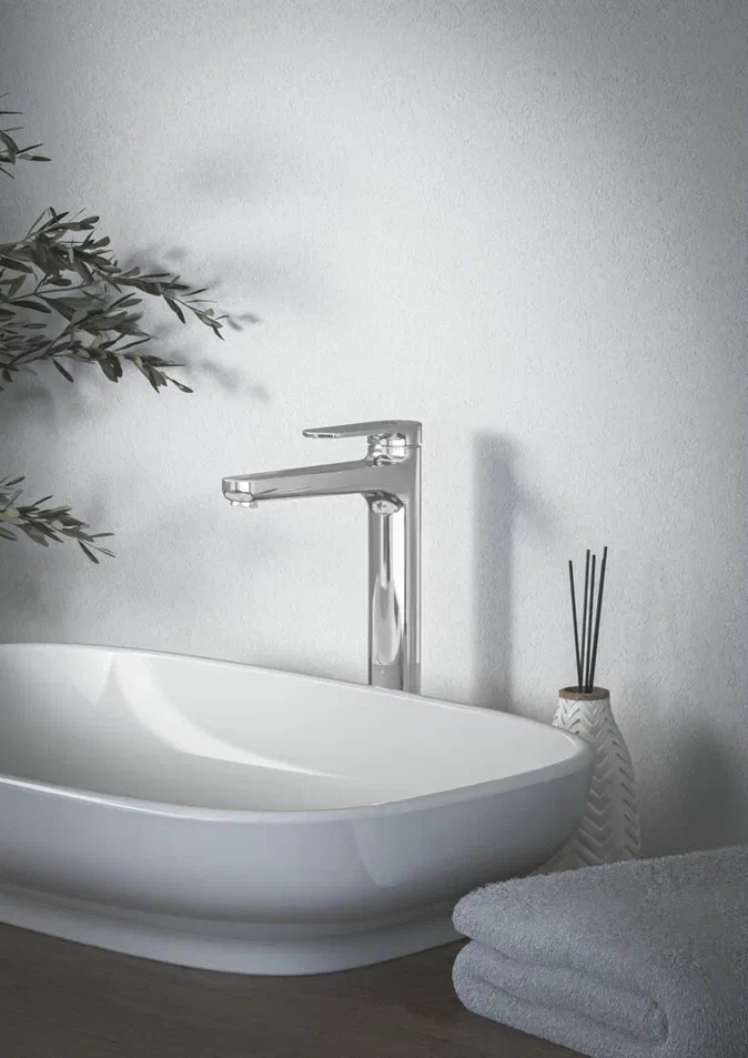 CERAFINE O NUOVO Смеситель для раковины H250, керамический картридж FirmaFlow 28 мм с функцией HWTC (ограничение максимальной температуры горячей воды), металлическая рукоятка с индикаторами горячей / холодной воды, аэратор 3,8 л/мин, система монтажа EASY-FIX (облегченный монтаж), гибкая подводка G3/8", технология Blue Start. Упаковка без пластика.