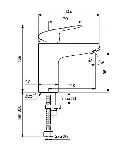 CERAFLEX GRANDE Смеситель для умывальника, система монтажа EASY-FIX (облегченный монтаж), литой излив, длина излива 110 мм, аэратор PERLATOR с ограничением потока 5 л/мин, новый керамический картридж IS 40 мм, с функцией HWTC (ограничение максимальной температуры горячей воды), без функции CLICK, металлическая рукоятка, индикатор холодной/горячей воды, гибкая подводка G3/8" PEX, шланги стандартной длины 400 мм, без донного клапана.