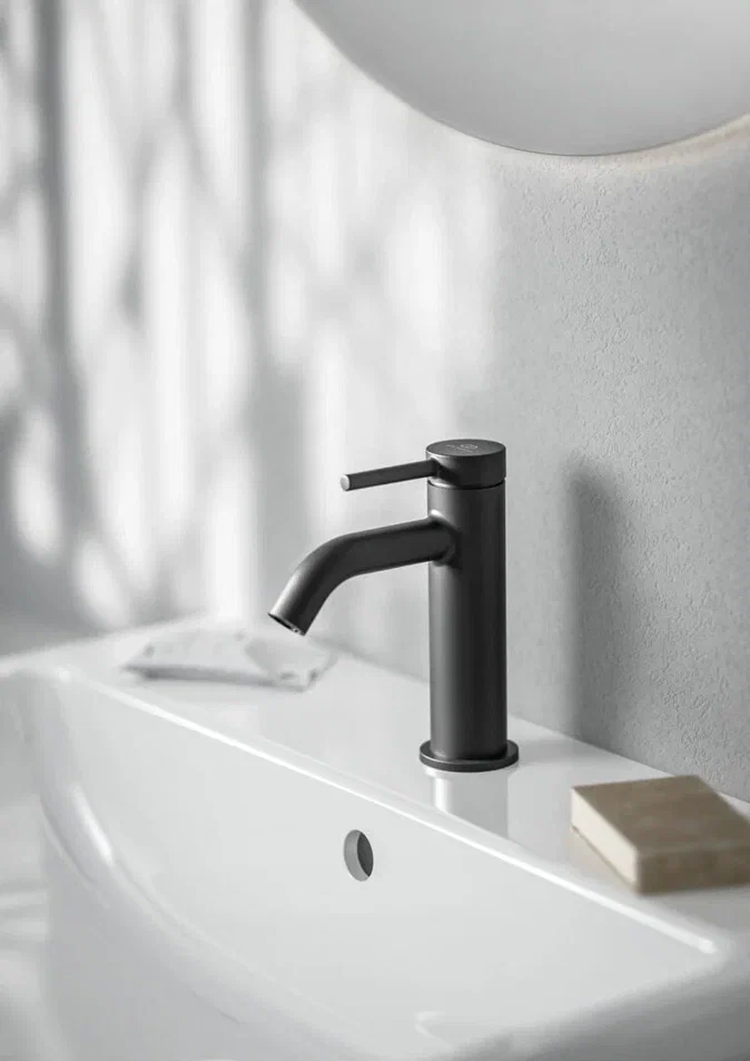 CERALINE NUOVO Смеситель для раковины H85, керамический картридж FirmaFlow 28 мм с функцией HWTC (ограничение максимальной температуры горячей воды), металлическая рукоятка с индикаторами горячей / холодной воды, аэратор 3,8 л/мин, система монтажа EASY-FIX (облегченный монтаж), гибкая подводка G3/8", технология Blue Start. Упаковка без пластика.