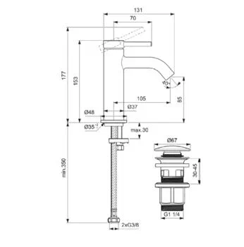 CERALINE NUOVO Смеситель для раковины H85 с независимым донным клапаном Click, керамический картридж FirmaFlow 28 мм с функцией HWTC (ограничение максимальной температуры горячей воды), металлическая рукоятка с индикаторами горячей / холодной воды, аэратор 3,8 л/мин, система монтажа EASY-FIX (облегченный монтаж), гибкая подводка G3/8", технология Blue Start. Упаковка без пластика.
