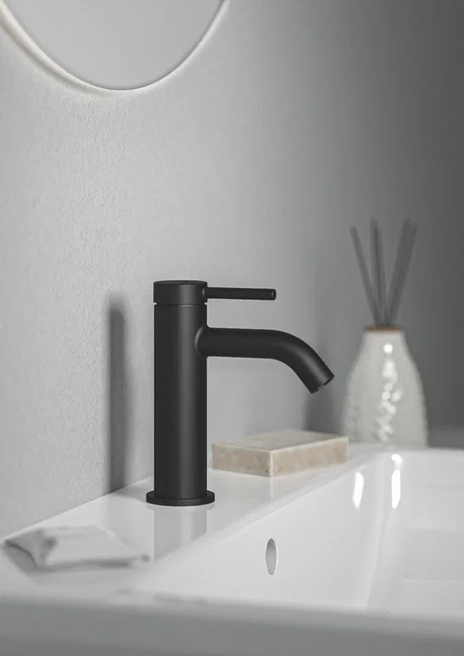 CERALINE NUOVO Смеситель для раковины H85 с независимым донным клапаном Click, керамический картридж FirmaFlow 28 мм с функцией HWTC (ограничение максимальной температуры горячей воды), металлическая рукоятка с индикаторами горячей / холодной воды, аэратор 3,8 л/мин, система монтажа EASY-FIX (облегченный монтаж), гибкая подводка G3/8", технология Blue Start. Упаковка без пластика.
