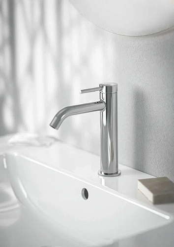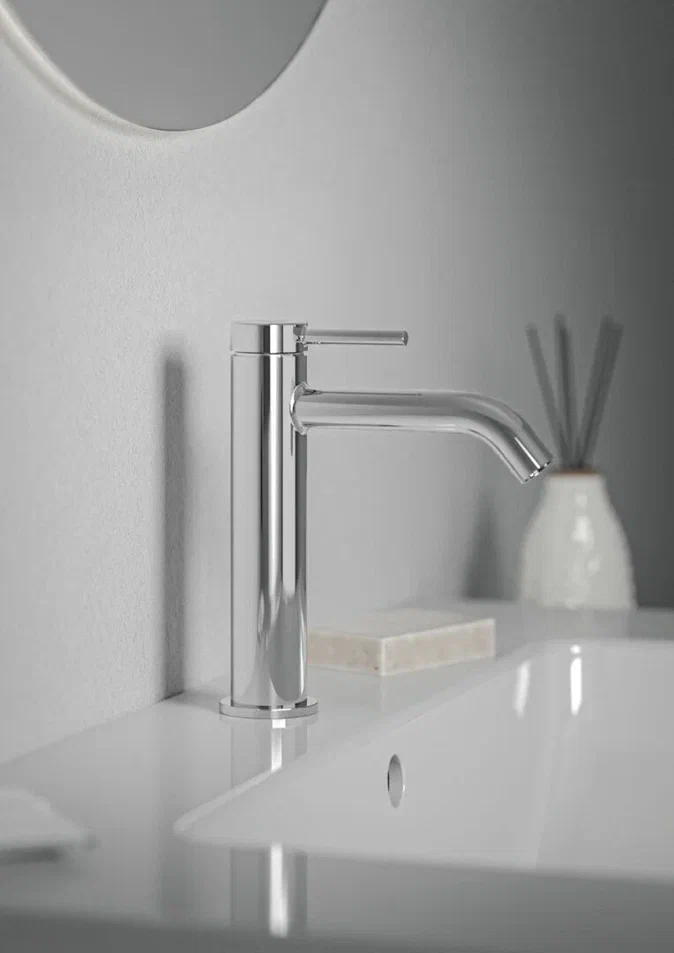 CERALINE NUOVO Смеситель для раковины H120, керамический картридж FirmaFlow 28 мм с функцией HWTC (ограничение максимальной температуры горячей воды), металлическая рукоятка с индикаторами горячей / холодной воды, аэратор 3,8 л/мин, система монтажа EASY-FIX (облегченный монтаж), гибкая подводка G3/8", технология Blue Start. Упаковка без пластика.