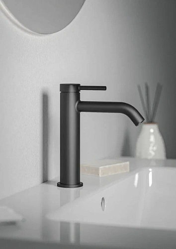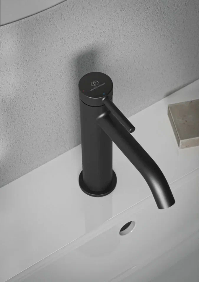 CERALINE NUOVO Смеситель для раковины H120, керамический картридж FirmaFlow 28 мм с функцией HWTC (ограничение максимальной температуры горячей воды), металлическая рукоятка с индикаторами горячей / холодной воды, аэратор 3,8 л/мин, система монтажа EASY-FIX (облегченный монтаж), гибкая подводка G3/8", технология Blue Start. Упаковка без пластика.