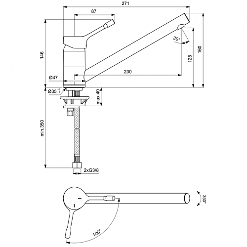 CERALOOK Однорычажный смеситель для кухонной мойки, трубчатый поворотный излив (длина 230 мм, высота 128 мм), угол поворота 360?, технология Blue Start, керамический картридж 38 мм Firmaflow® с функцией HWTC (ограничение максимальной температуры горячей воды), с функцией CLICK (ограничение потока воды), гибкая подводка G3/8" (антибактериальные шланги PEX), система монтажа EASY-FIX (облегченный монтаж) с пластиковой опорной пластиной для более стабильного монтажа на мойке из нержавеющей стали, аэратор Perlator, металлическая рукоятка с индикаторами горячей/холодной воды (индикатор холодной воды расположен по центру).