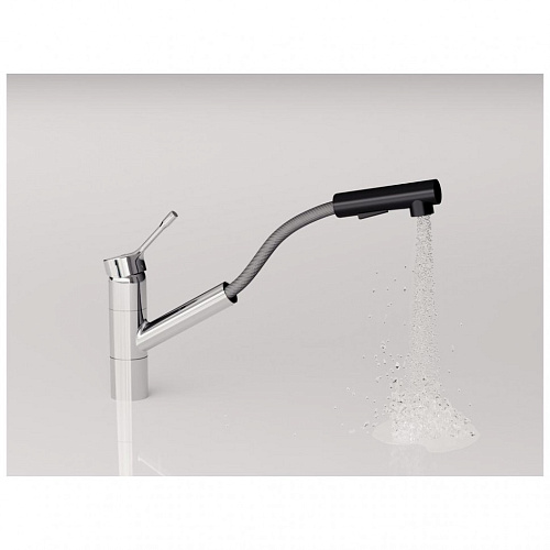 CERALOOK Однорычажный смеситель для кухонной мойки, трубчатый поворотный выдвижной излив (длина 233 мм, высота 170 мм), 2-х функциональный душ, угол поворота 360?, технология Blue Start, керамический картридж 38 мм Firmaflow® с функцией HWTC (ограничение максимальной температуры горячей воды), с функцией CLICK (ограничение потока воды), гибкая подводка G3/8" (антибактериальные шланги PEX), монтаж IS-Fix - крепеж на центральной гайке M33x1,5 с двумя блокирующими винтами с пластиковой опорной пластиной для более стабильного монтажа на мойке из нержавеющей стали, аэратор Perlator, металлическая рукоятка с индикаторами горячей/холодной воды (индикатор холодной воды расположен по центру).