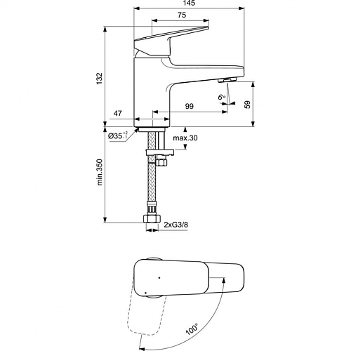 CERAPLAN Смеситель для раковины без донного клапана, технология Blue Start, система монтажа EASY-FIX (облегченный монтаж), гибкая подводка G3/8", картридж FirmaFlow 38 мм с функцией HWTC (ограничение максимальной температуры горячей воды), металлическая рукоятка с индикаторами горячей/холодной воды, аэратор Slim с ограничением потока 5 л/мин.