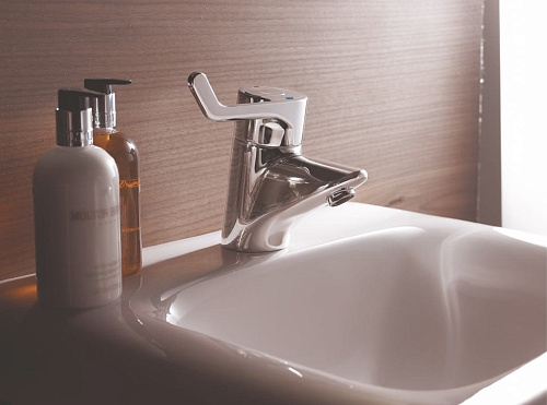 CERAPLUS Sequential Термостатический смеситель для раковины под 1 отверстие с цикловым затвором, удлиненная металлическая рукоятка с индикаторами горячей/холодной воды, термостатический картридж с цикловым затвором, антивандальный ламинарный регулятор потока (защита от попадания бактерий) M24x1, упрочненная гибкая подводка SPX G3/8, без донного клапана.