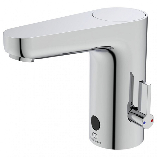 CERAPLUS Смеситель для раковины со смешиванием, работа от батарейки, система монтажа EASY-FIX (облегченный монтаж), литой излив; боковая металлическая рукоятка для регулировки температуры; крышка сенсора в комплекте (для использования во время чистки корпуса), длина излива 116 мм, ламинарный регулятор потока (защита от попадания бактерий) с ограничением потока 5 л/мин. электромагнитный клапан интегрирован в корпус, полнофункциональный электронный датчик (регулируемые функции), внешняя литиевая батарейка (DC 6V), гибкая подводка G3/8", шланги стандартной длины 400 мм. Изделие может использоваться только в системах высокого давления (мин. 0,5 атм); рекомендована предварительная установка фильтра 50 мм (для обеспечения надлежащей работы электромагнитного клапана).