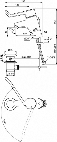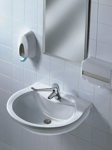 CERAPLUS Sequential Смеситель для раковины под 1 отверстие с цикловым затвором, рукоятка – 180 мм, с индикатором горячей/холодной воды, антивандальный ламинарный регулятор потока (защита от попадания бактерий) M24x1, картридж 47 мм с цикловым затвором, с функцией перекрытия горячей воды, упрочненная гибкая подводка SPX G3/8, система монтажа EASY-FIX (облегченный монтаж), стальной болт, металлический донный клапан.