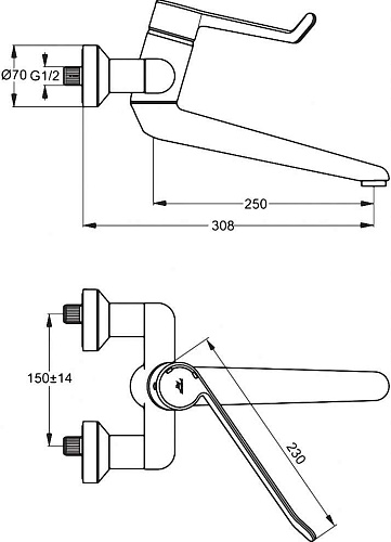 CERAPLUS Sequential Настенный смеситель для раковины с цикловым затвором, монтаж на стандартных эксцентриках с шумопонижателем, рукоятка – 230 мм, с индикатором горячей/холодной воды, антивандальный ламинарный регулятор потока (защита от попадания бактерий) M24x1, картридж 47 мм с цикловым затвором, с функцией перекрытия горячей воды, излив 250 мм, три варианта крепежа излива: фикс. среднее положение, ограниченное движение ±45°, неограниченное движение, герметичные накладки, скрытый монтаж.