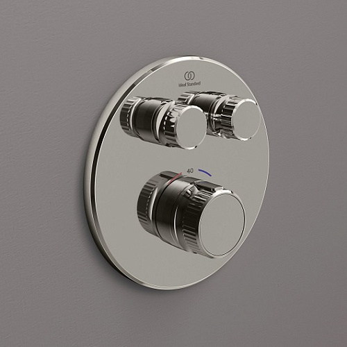 CERATHERM NAVIGO Встраиваемый термостатический смеситель для душа, комплект №2 (функциональный комплект и накладка для настенного монтажа); термостатический картридж FirmaFlow Therm; без душевого гарнитура; 2 рукоятки потока - управление двумя независимыми друг от друга потоками (2-х функциональные металлические рукоятки - включение/выключение нажатием и регулировка потока поворотом); металлическая рукоятка с ограничителем температуры 40°C, с насечкамим для удобного захвата; плоская металлическая накладка. Простота в эксплуатации благодаря эргономичным ручкам и достаточному расстоянию между элементами управления. Для монтажа с комплектом EASY-BOX A1000NU (заказывается дополнительно)