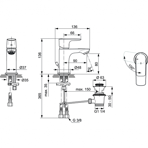 CONNECT AIR Piccolo Смеситель для раковины, тонкий корпус 36 мм, технология Blue Start, система монтажа EASY-FIX (облегченный монтаж), аэратор Perlator M24x1 с ограничением потока 5 л/мин. керамический картридж 25 мм без функции HWTC, без функции CLICK, гибкая подводка PEX G3/8" 400 мм, металлический донный клапан.