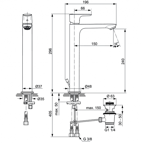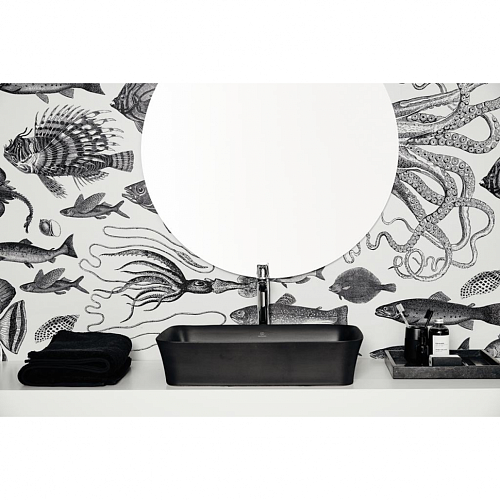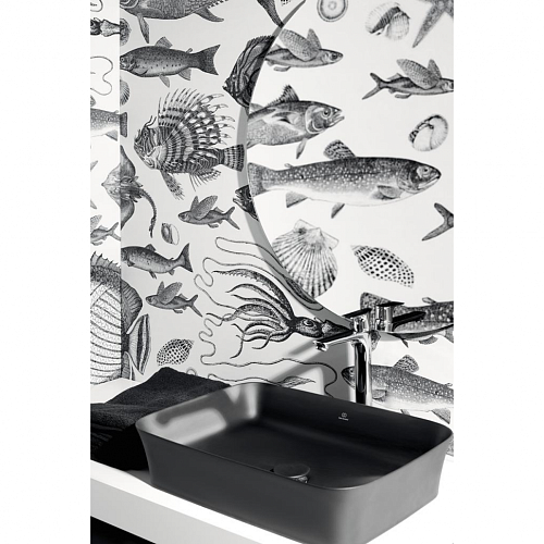 CONNECT AIR Vessel Смеситель для раковины, тонкий корпус 36 мм, технология Blue Start, система монтажа EASY-FIX (облегченный монтаж), аэратор Perlator с ограничением потока 5 л/мин. керамический картридж 25 мм без функции HWTC, без функции CLICK, гибкая подводка PEX G3/8" 400 мм, металлический донный клапан.