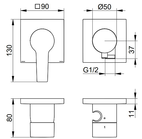 Оснащение Смеситель - картридж с ограничителем температуры (рычаг, гильза, розетка (квадратная)), встраиваемый переключатель с выводом для шланга с конической гайкой и держателем рукояткой, гильзой, розеткой (квадратной) и запорным вентилем, с обратным клапаном.