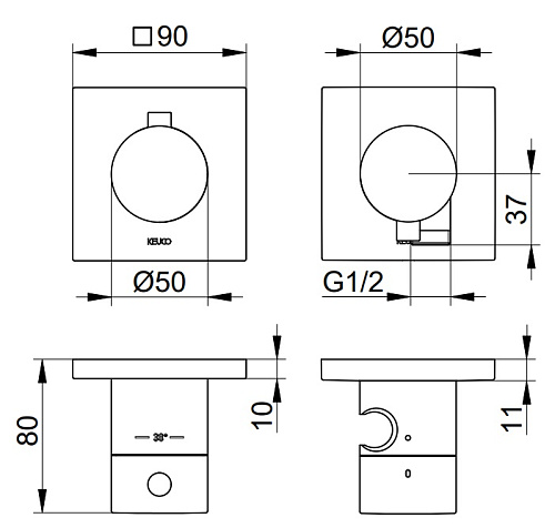 Оснащение Смеситель с термостатом, рукоятка, гильза, розетка (квадратная), встраиваемый запорный вентиль с переключателем для шлангов с конической гайкой рукоятки, гильзой, розеткой (квадратной), с обратным клапаном.