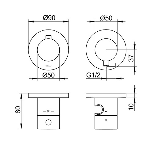 Оснащение Смеситель с термостатом, рукоятка, гильза, розетка (круглая), встраиваемый переключатель с выводом для шланга с конической гайкой и держателем лейки, с рукояткой, гильзой, розеткой (круглой), запорный вентиль с обратным клапаном.