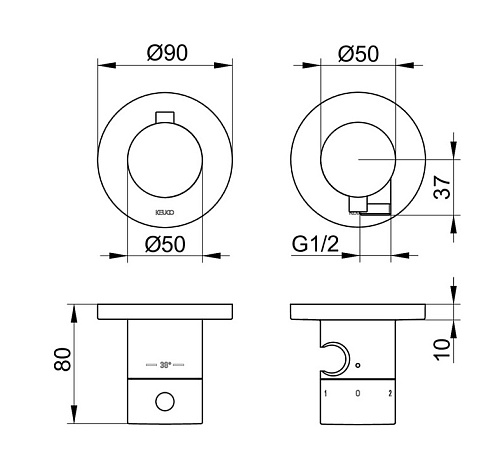 Оснащение Смеситель с термостатом с рукояткой, гильза, розетка (круглая), встраиваемый переключатель с выводом для шланга с конической гайкой и держателем лейки, с рукояткой, гильзой, розеткой (круглой), запорный вентиль с обратным клапаном.