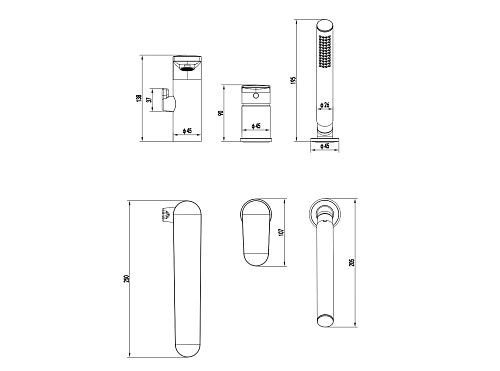 Оснащение 1. Смеситель 2. Излив смесителя 3. Дивертор 4. Ручная лейка 5. Шланг для лейки 150 см 6. Гибкая подводка