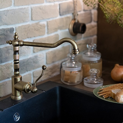 Однорычажный высокий смеситель в винтажном стиле украсит кухню, его поворотный длинный излив позволят менять направление потока воды. Изысканная форма позволит сделать смеситель самостоятельным арт-объектом на кухне. Антикварные изгибы DUOMO будут органично смотреться в стилях классика, винтаж или по-новому раскроют интерьер в стиле фьюжн.