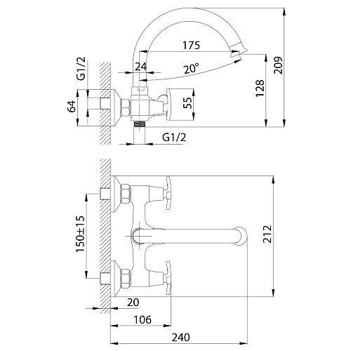 Оснащение Аэратор, переключатель потоков, эксцентрики, держатель для душа, душевая лейка, душевой шланг, настенный держатель.