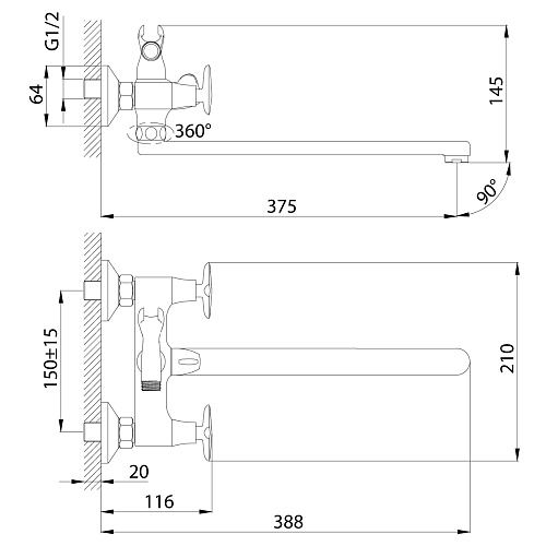 Оснащение Аэратор, переключатель потоков, эксцентрики, держатель для душа, душевая лейка, душевой шланг, настенный держатель.