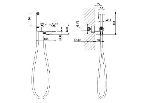 Оснащение 1. Смеситель для душа (внешняя и скрытая часть) 2. Душевой гарнитур: гигиеническая лейка, шланг, шланговое подсоединение с держателем 3. Декоративные накладки на стену из нержавеющей стали 2,5 мм