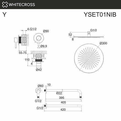 - верхний душ D=300 мм: латунь; - длина кронштейна верхнего душа 395 мм: латунь; - встраиваемая часть смесителя в комплекте; - пропускная способность: 23 л/мин при давлении 3 Бар. Состав комплекта: - смеситель для душа скрытого монтажа - Y1245NIB;