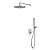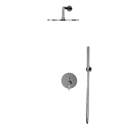 - автоматический переключатель; - верхний душ D=300 мм: латунь; - длина кронштейна верхнего душа 395 мм: латунь; - душевой шланг в металлической оплетке; - длина шланга 150 см; - ручной душ, 1 режим: латунь; - встраиваемая часть смесителя в комплект