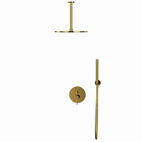 - автоматический переключатель; - верхний душ D=300 мм: латунь; - длина кронштейна верхнего душа 240 мм: латунь; - душевой шланг в металлической оплетке; - длина шланга 150 см; - ручной душ, 1 режим: латунь; - встраиваемая часть смесителя в комплект