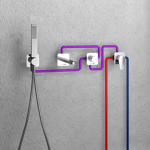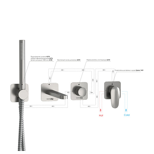 Оснащение Смеситель для ванны и душа Spree 1451, Переключатель на 2 выхода А272, Подключение шланга A275, Лейка 1-функциональная A276, Шланг для душа 1500 мм A100, Настенный излив для ванны A274