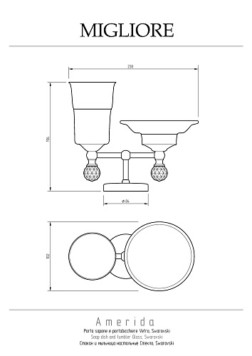 Стакан и мыльница настольные коллекции Amerida бренда Migliore – это многофункциональный аксессуар для ванной комнаты. Аксессуар украшен кристаллом Сваровски. При необходимости стакан и мыльницу можно вынуть из посадочного места, чтобы помыть. Изделие выполнено из латуни и имеет высококачественное хромо-никелевое покрытие, которое при правильном уходе надолго сохранит свой блеск. Рекомендуется использовать чистящее средство бренда Migliore для смесителей и аксессуаров с хромированным покрытием.