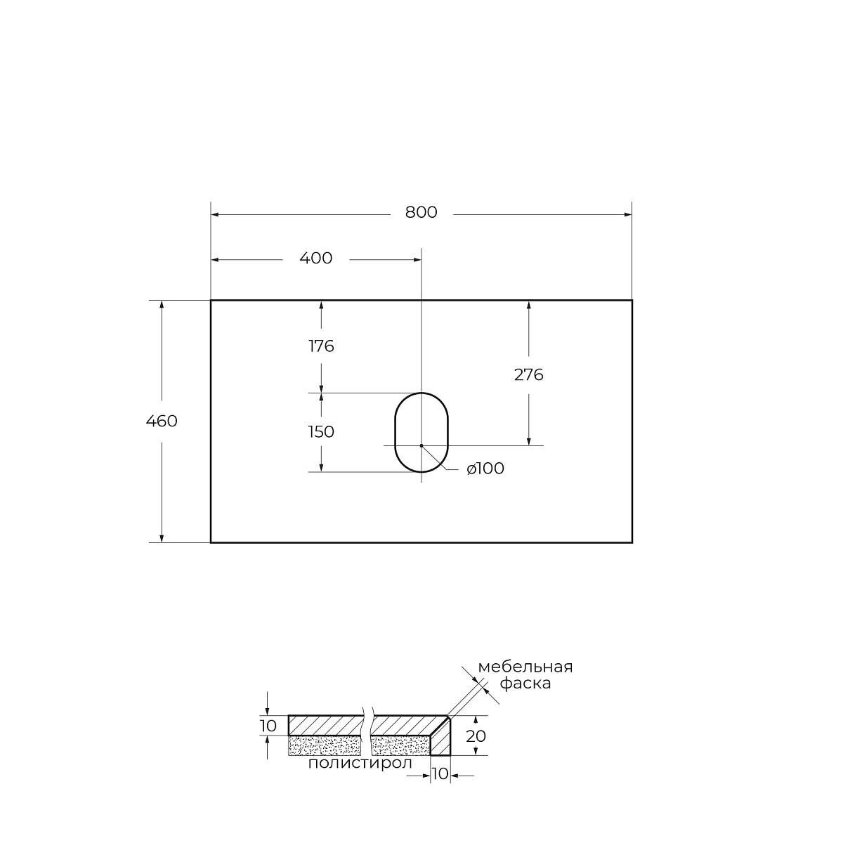 Столешница из керамогранита с расцветкой под мрамор толщиной 20 мм, без отверстия под смеситель. Доступные цвета столешницы: Marmo Crema Opaco (Бежевый матовый мрамор), Marmo Grigio Lucido (Серый глянцевый мрамор), Marmo Nero Opaco (Чёрный матовый мрамор).
