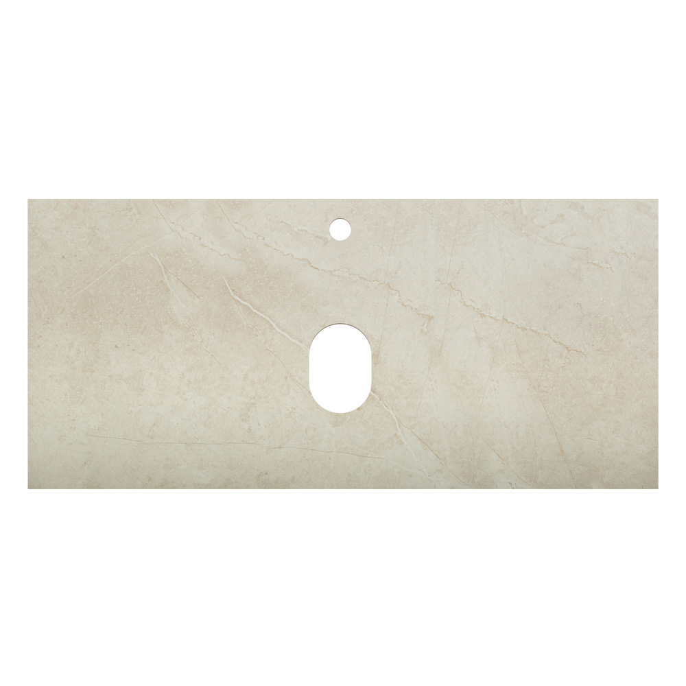 Столешница из керамогранита с расцветкой под мрамор толщиной 20 мм, с отверстием под смеситель. Доступные цвета столешницы: Marmo Crema Opaco (Бежевый матовый мрамор), Marmo Grigio Lucido (Серый глянцевый мрамор), Marmo Nero Opaco (Чёрный матовый мрамор).