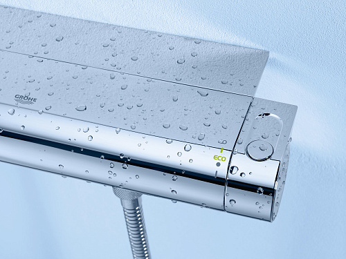 настенный монтаж 100% GROHE CoolTouch корпус изделия + S-образные эксцентрики GROHE StarLight хромированная поверхность GROHE Aqua Paddle эргономичные рукоятки рукоятка выбора температуры со стопором при 38°C GROHE SafeStop Plus опционно огачничитиель температуры на 43°C, включен встроенный стопор смешанной воды GROHE TurboStat встроенный термоэлемент рукоятка расхода с экономичной кнопкой GROHE EcoButton и индивидуально устанавливаемым стопором Carbodur керамический вентиль 1/2", 180° отвод для душа снизу 1/2" встроенные обратные клапаны грязеулавливающие фильтры с защитой от обратного потока скрытые S-образные эксцентрики, CoolTouch розетки с уплотнением к стене GROHE EasyReach полочка съемная съемная хром минимальное давление 1,0 бар GROHE EcoJoy Технология совершенного потока при уменьшенном расходе воды