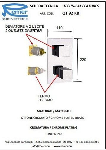 Термостат встр., внешняя часть Remer Rubinetterie QUBIKA QT92KBNO