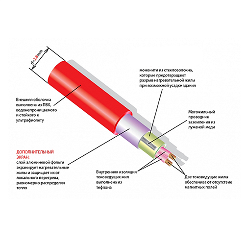• Небольшая толщина кабеля (всего 2,8 мм - это позволяет устанавливать его без предварительной стяжки и заливки пола);
