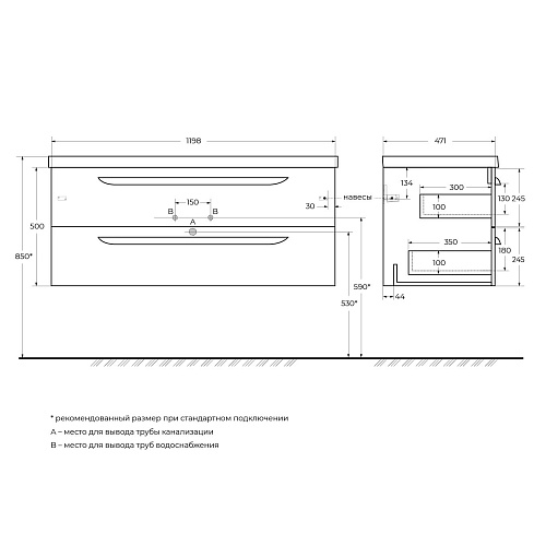 ECO База под раковину подвесная с двумя выкатными ящиками, Bianco Opaco, 1198x472x500, ECO-1200-2C-SO-BO