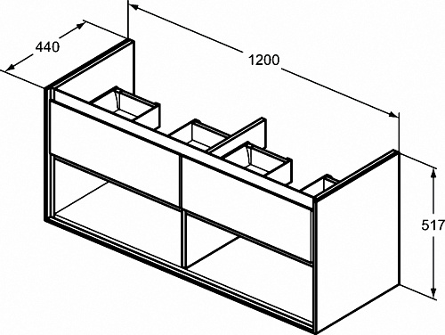 CONNECT AIR Тумба для раковины для подвесного монтажа, с 2-мя ящиками, система плавного закрытия, с открытым пространством для хранения под ящиками, с крепежом. Для монтажа с раковиной CONNECT AIR Vanity 124 см E027301 или раковиной-чашей CONNECT AIR 40 см E034701 (2 шт.) со столешницей E0852 или раковиной-чашей CONNECT AIR 60 см E034801 (2 шт.) со столешницей E0852. Рекомендуется сифон Space Saving EE23033967 (заказывается отдельно).