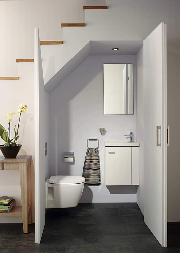 CONNECT SPACE Тумба - узкая проекция, глубина тумбы 25 см, настенный монтаж. Специальная L-форма двери, экономящая пространство, максимальное открытие 105?. Съемная полка на дверце для доступа без необходимости полного открытия. Плавное закрытие. Ручка в комплекте. Правая версия. Для монтажа с раковиной E136101.