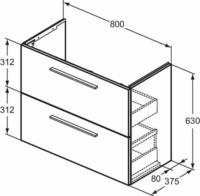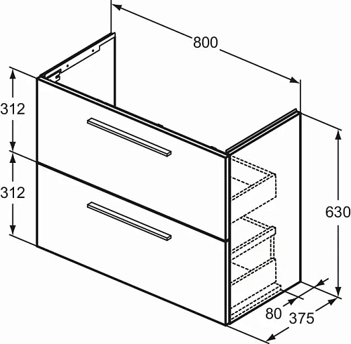 i.Life S Тумба для раковины 80 см, для подвесного монтажа, с 2-мя ящиками, система плавного закрытия, ручки в комплект не включены (заказываются дополнительно), с крепежом. Для монтажа с раковиной i.Life S Vanity 81 см T458901. Рекомендуется сифон Space Saving EE23033967 (заказывается дополнительно)