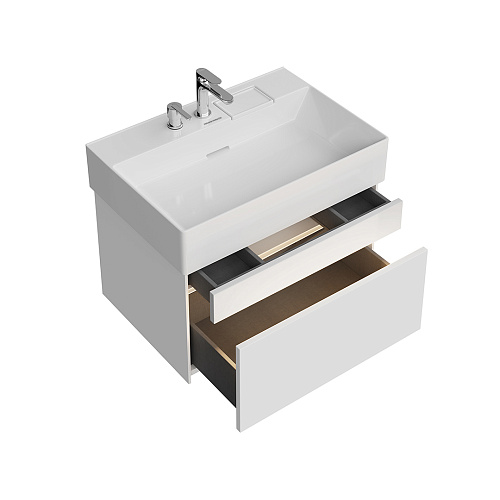 Фасады и корпус выполнены из МДФ в цвете «Белый белоснежный»: верхний фасад — глянцевый, нижний фасад и корпус — матовые. Тумба имеет два выдвижных ящика с открытием Push to open, с внутренней отделкой «Лён Антрацит». Верхний ящик, благодаря нестандартному расположению сифона, содержит больше полезного пространства и удивляет стеклянной вставкой в основании: через такое «окно» снизу струится свет, эффектно подчёркивая содержимое.