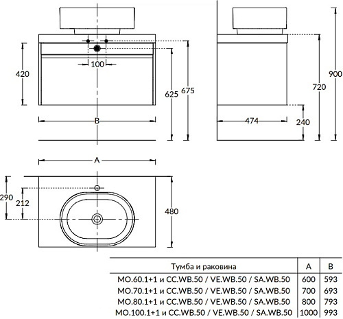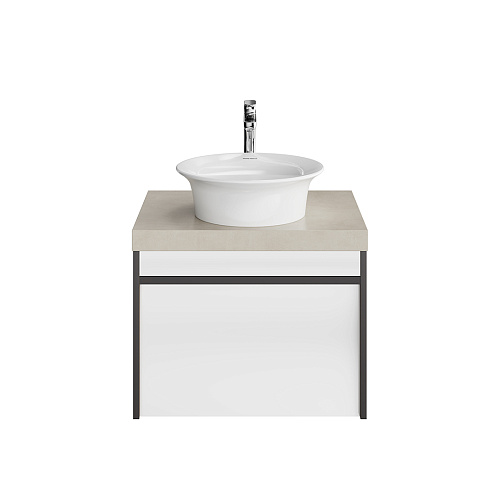 Мебель MODULA может быть использована для установки как мебельных раковин, так и любой из накладных, которые в этом случае устанавливаются на керамическую столешницу CANALETTO. Боковины тумбы выполнены в цвете «Арабика», фасад — белый глянцевый.