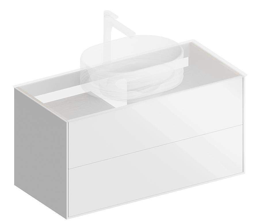 Подвесная тумба в белом глянцевом цвете с двумя выдвижными вместительными ящиками, оснащенными системой открывания Push-to-Open. Сочетается со столешницами PLAZA Modern и накладными раковинами серии PLAZA.