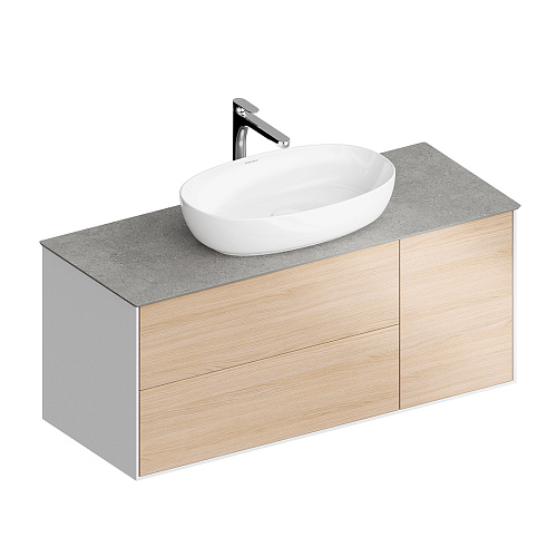 Подвесная тумба в цвете «дуб Виченца» с тремя выдвижными вместительными ящиками, оснащенными системой открывания Push-to-Open. Сочетается со столешницами PLAZA Modern и накладными раковинами серии PLAZA.
