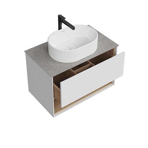 Подвесная тумба в белом глянцевом цвете с одним выдвижным ящиком и открытой полкой. Вместительный ящик оснащен системой открывания Push-to-Open. Сочетается со столешницами PLAZA Modern и накладными раковинами серии PLAZA.